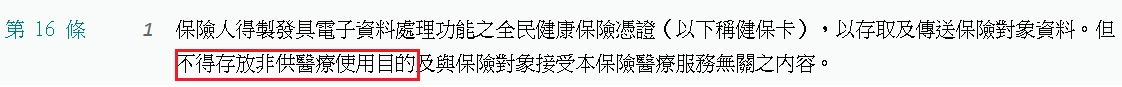 根據《全民健康保險法》第16條規定,健保卡只能做為醫療憑證,不可以被使用在非醫療目的上。