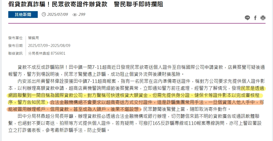 ⚠️警方提醒,合法貸款流程不會要求寄出證件或交付原件,所有核對都應在面談或官方管道進行,若遇到「只要證件影本就能撥款」的廣告,幾乎可以直接判定是詐騙。